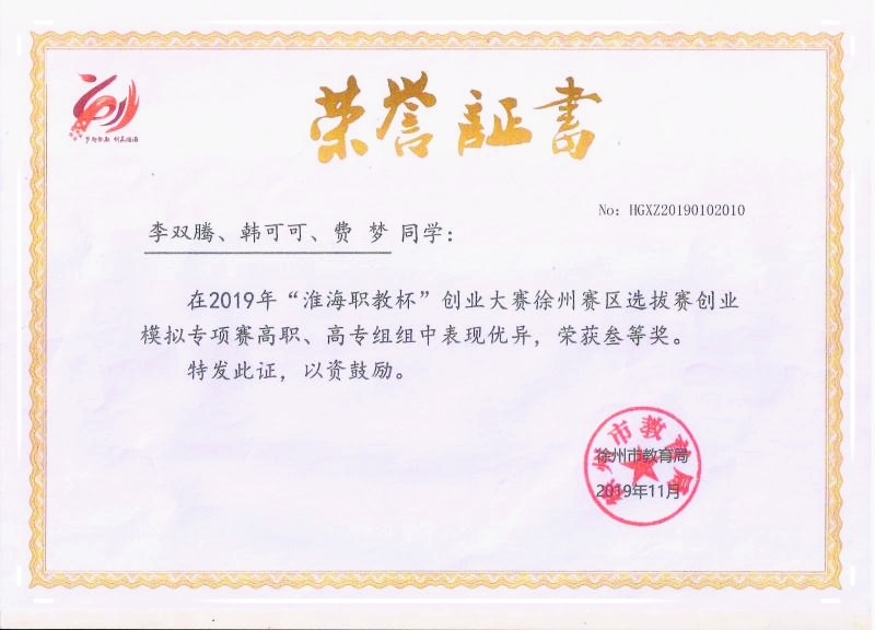 10月31日至11月1日,2019年“淮海职教杯”创业大赛徐州赛区选拔赛在徐州工业职业技术学院举行,来自全市23所学校的80个项目参加比赛,本次大赛以“梦起职教、创赢淮海”为主题,涵盖科技创新类、文化创意类、社会服务业类等各方面,设立创业模拟专项赛、创业实践挑战赛两类项目,有中职组、高职高专组、毕业生组、在校生组4个组别。我系学生李双腾、韩可可、费梦获得创业模拟专项赛高职、高专组三等奖。