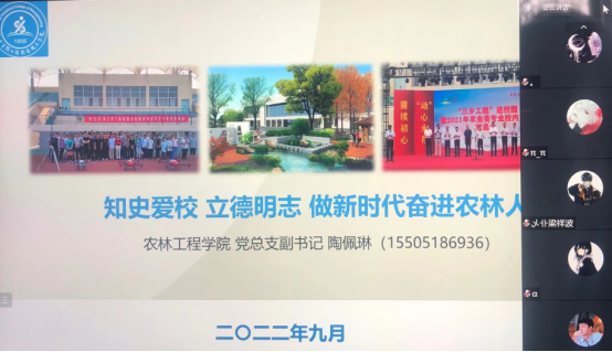 党总支副书记陶佩琳结合新时代对大学生的要求,以“知史爱校,立德明智,做新时代奋进农林人”为题,引导新生正确认识大学,适应大学生活,实现角色转换,养成良好行为习惯,为顺利完成大学学业,个人成长奠定坚实的基础。
