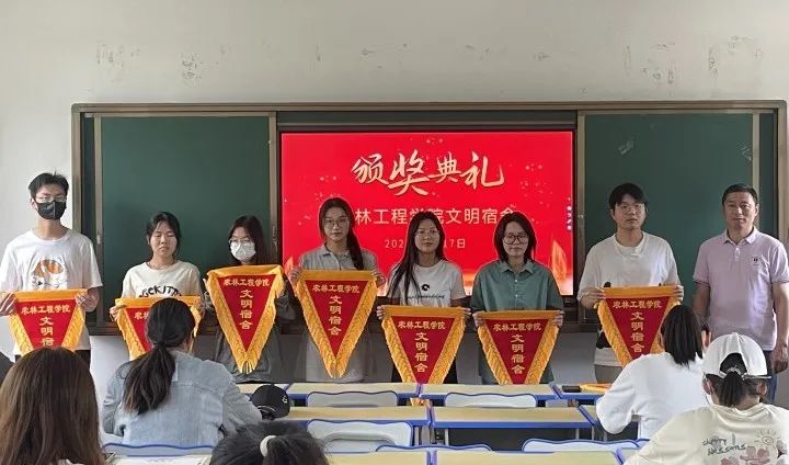 根据全体班主任检查宿舍美化及卫生成绩,结合宿舍全体成员学习成绩、英语、计算机等级证、技能证书等获奖情况。最终评选出25间农林工程学院文明宿舍。农林工程学院党总支书记张明老师、辅导员陈子雨、李守航老师参加了颁奖仪式,为获奖宿舍颁发了锦旗和奖品。