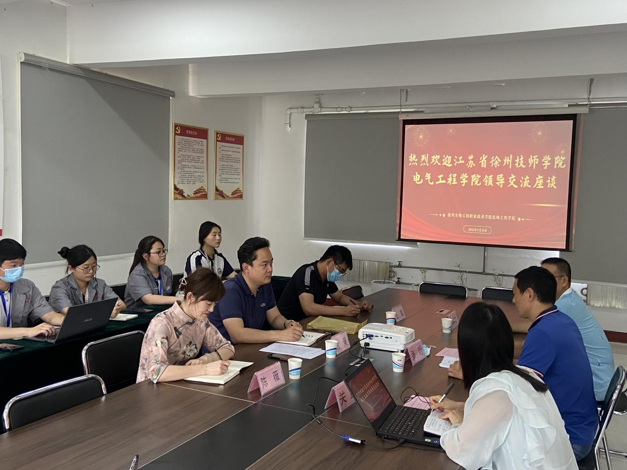 5月31日下午,江苏省徐州技师学院电气工程学院副院长易昊、学生科长王磊、教师陈薇等一行10人来访。学院党委书记张明,教学科长关滢,基地主任刘本文接待来宾并出席座谈交流会。