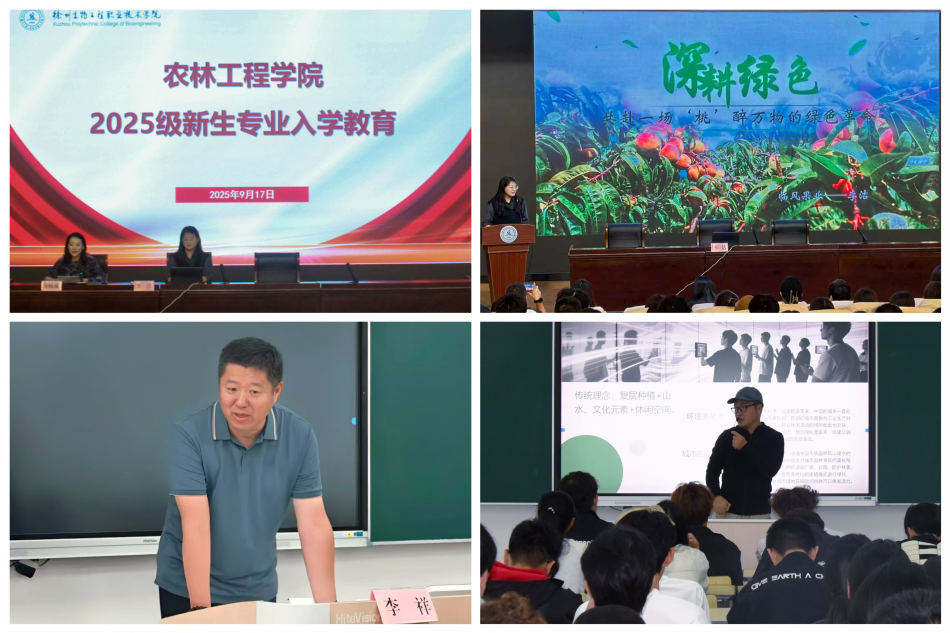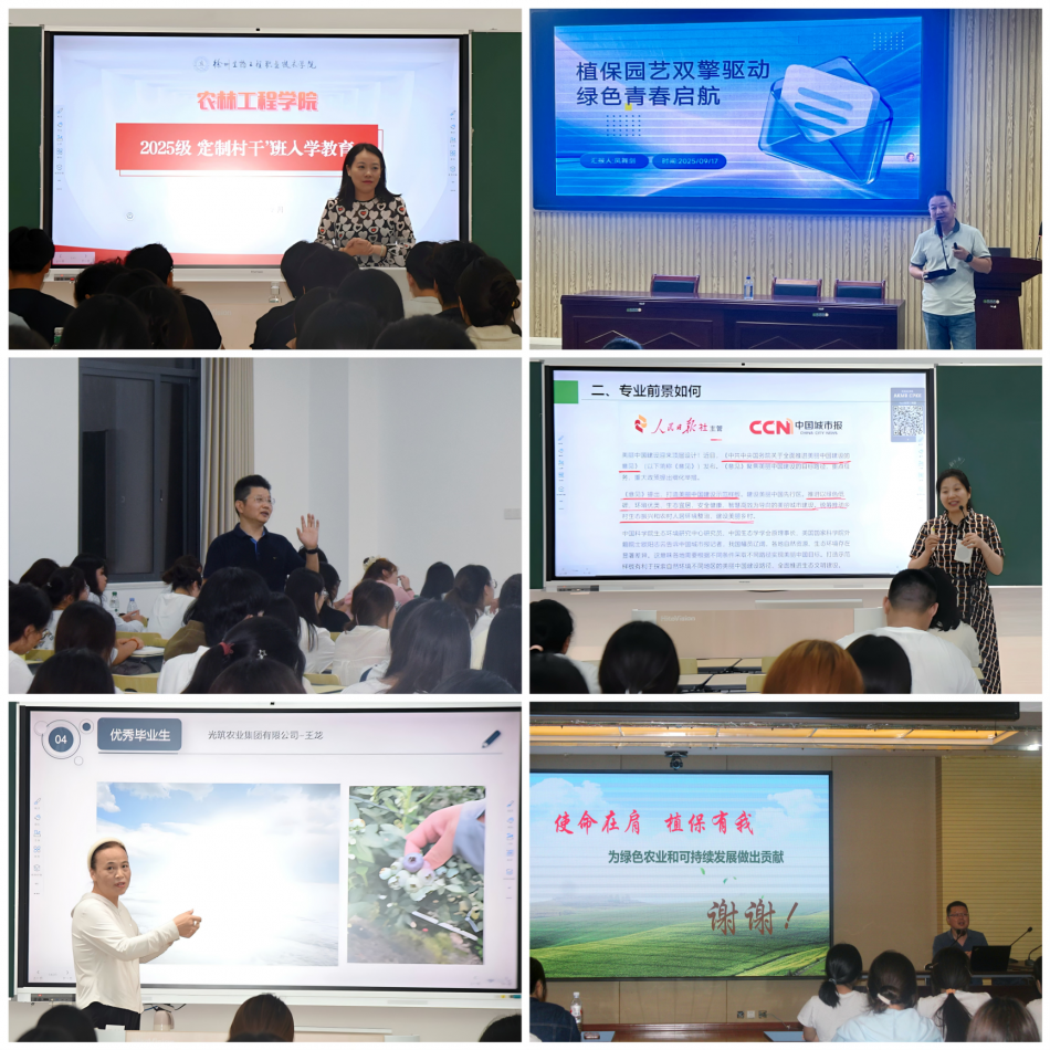 职业引航环节,依托“校企资源联动”,为新生打开职业发展“新视野”。学院特邀行业资深专家、优秀校友及基层干部走进校园,以实战经验与前沿视角为新生赋能。其中,2012届植物保护专业校友、丰县临风果蔬专业合作社负责人“桃子妹妹”李洁,以 “一颗桃子的产业蜕变”为切入点,生动展现现代农业融合生物技术、信息技术与美学设计的创新发展路径,深入解读绿色农业的发展机遇,为园艺技术、植物保护、现代农业技术专业新生勾勒“科技赋能农业”的职业发展蓝图;1992届农艺专业校友、徐州市惠通生态园林科技工程有限公司负责人李祥,结合自身创业历程,分享“理论-实践”衔接的学习方法与路径,强调扎实的专业知识对职业发展的支撑作用,为园林技术专业新生提供务实且具操作性的指导;徐州楠德花卉园艺有限公司总经理王德远,聚焦园林行业从“传统环境美化”向“生态修复 + 智慧赋能”的转型趋势,结合云龙湖风景区景观打造、九里湖湿地生态修复等重点项目实践,解读行业发展动态与技术革新方向。