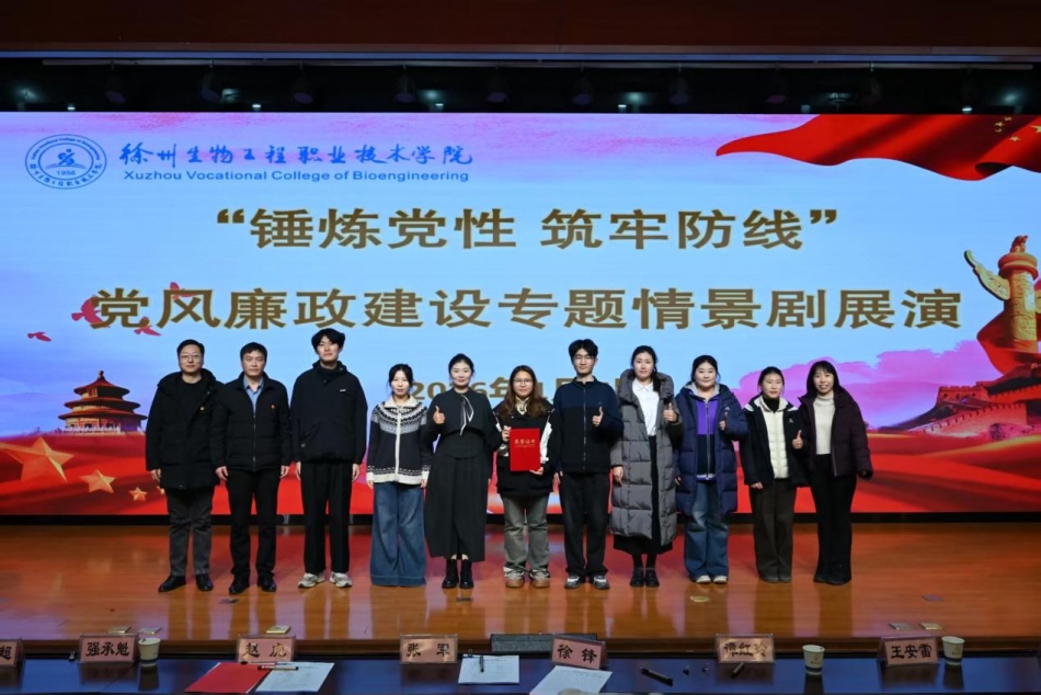 1月7日,徐州生物工程职业技术学院“清风润园 廉洁育人”2025年廉洁文化情景剧展示评比活动在三楼报告厅隆重举行。全校各二级学院精心报送的10部作品同台竞技、精彩纷呈。农林工程学院凭借原创情景剧《校园廉洁树》,以鲜明的主题立意、扎实的剧本创作和富有感染力的舞台表现,荣获综合二等奖,充分展现了我院在廉洁文化建设中的扎实成效与育人特色。
